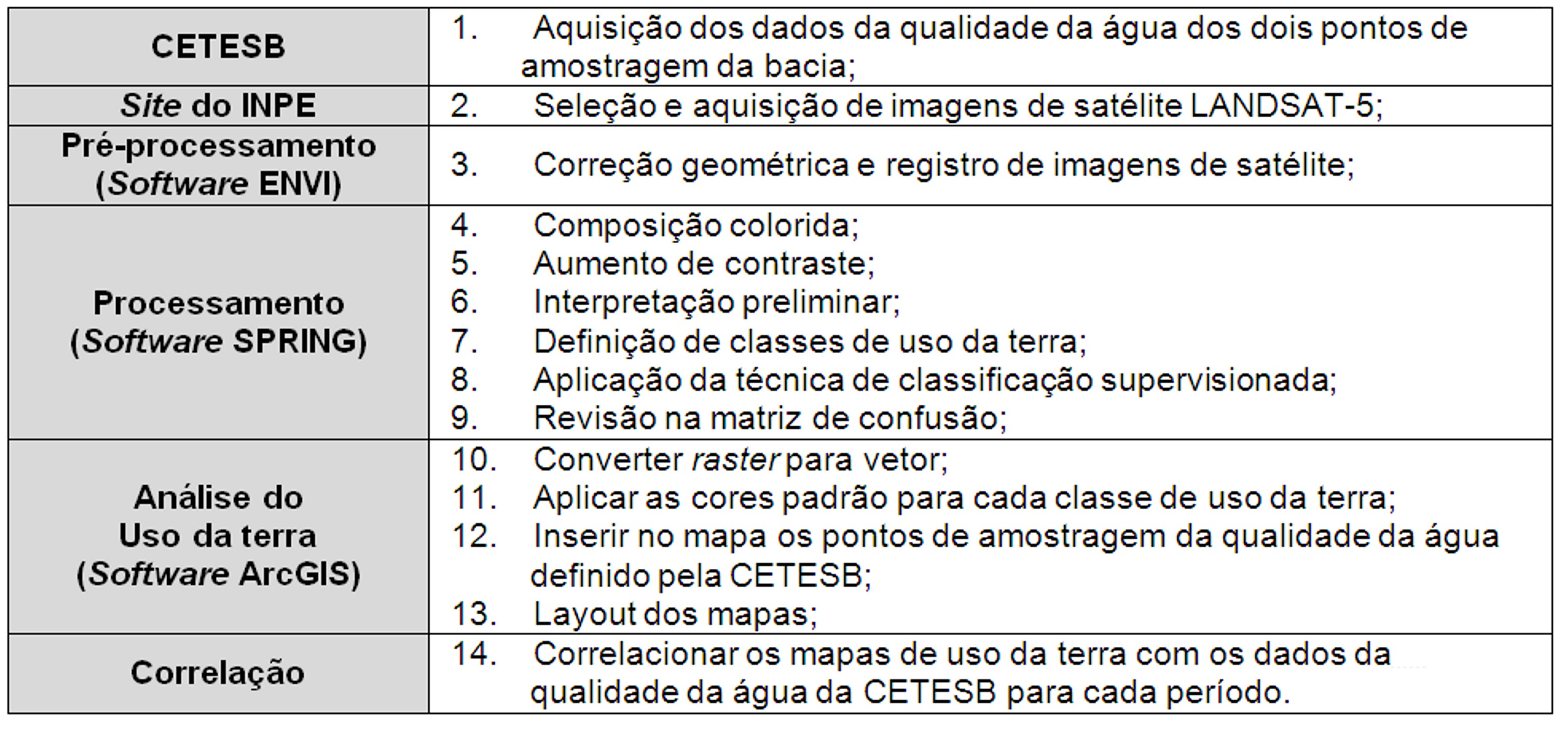O objetivo central deste trabalho é descrever a correlação temporal entre o uso da terra e a qualidade da água da Bacia Hidrográfica do Rio Baquirivu-Guaçu, nos municípios de Arujá e Guarulhos. Para tanto, utilizou-se o Índice de Qualidade da Água – IQA calculados pela CETESB e para o processamento digital das imagens de satélite e a geração dos mapas de uso da terra, foram utilizadas ferramentas de Sistemas de Informações Geográficas (SIG), com auxilio do aplicativo computacional ENVI 4.3, SPRING 5.1.7 e ArcGIS 9.3.