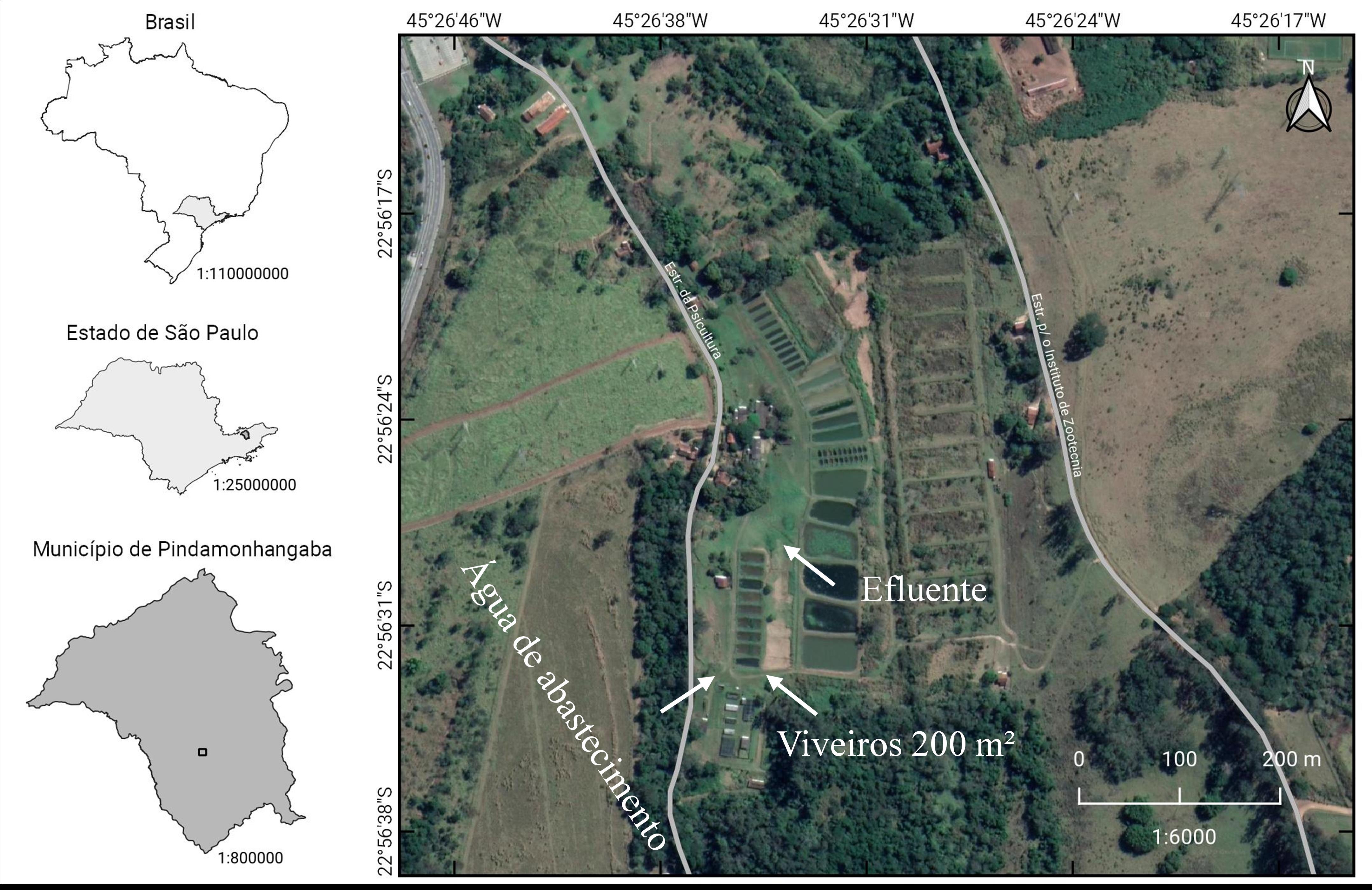 - Figura 1 – Localização da área de estudo. Em destaque os viveiros escavados de 200 m² distribuídos em série, o local de captação da água de abastecimento e local de lançamento do efluente dos viveiros. (Fonte Google Earth pro – Imagem obtida em 23 de julh