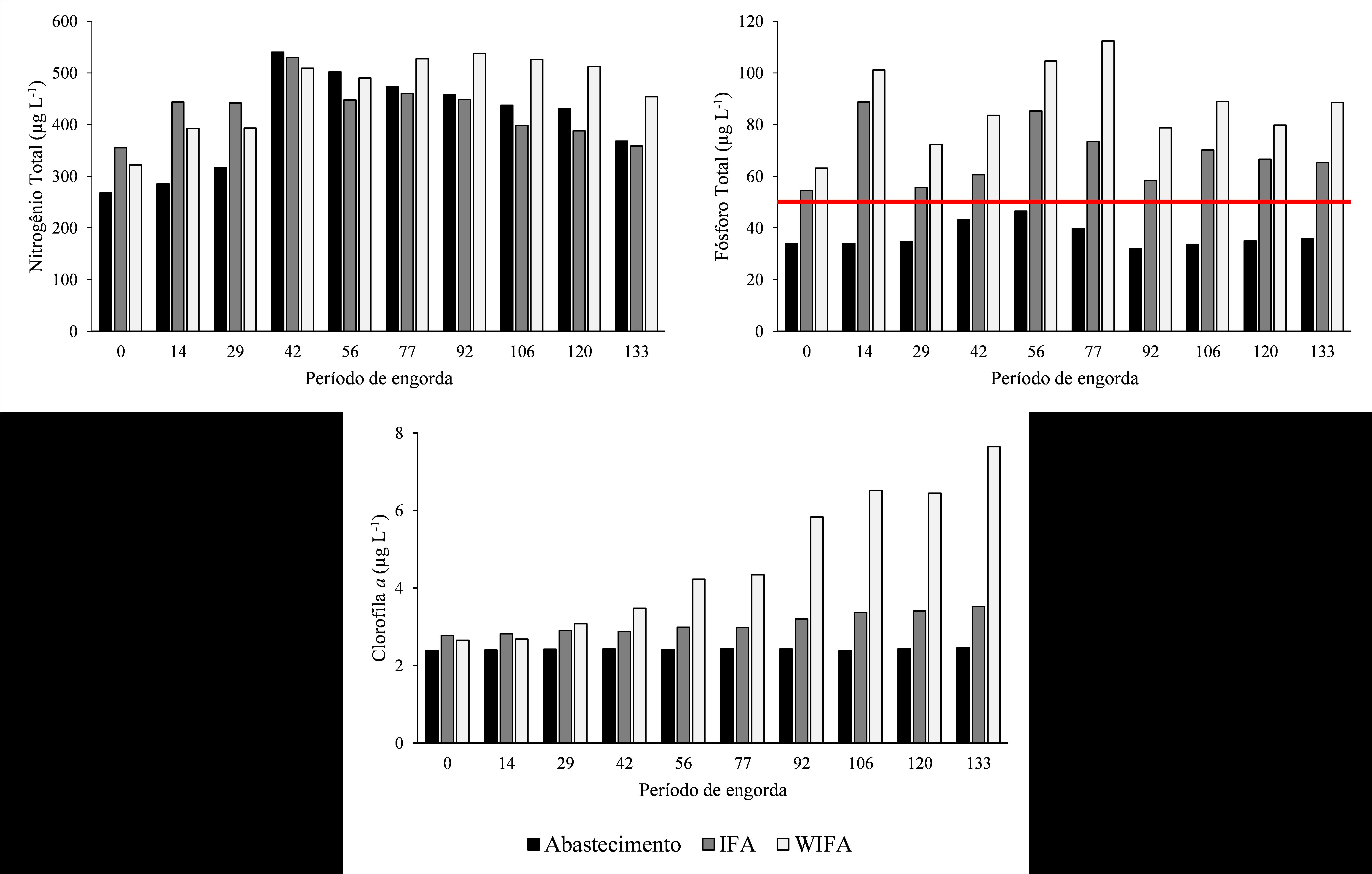 - Figura 3 – Concentrações de nitrogênio total, fósforo total e clorofila a da água de abastecimento e do efluente de viveiros de criação de tilápia-do-nilo com ilhas flutuantes artificiais (IFA) e colonizados com Eichhornia crassipes e sem ilhas flutuantes