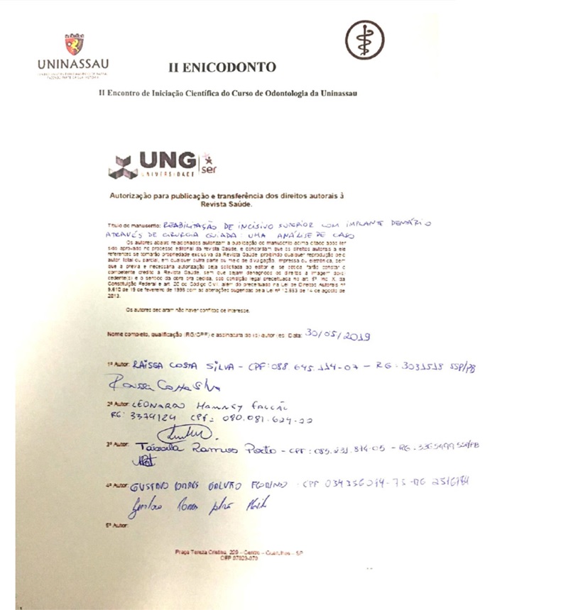 Silva, R. C., Falcão, L. H., Porto, T. R., & Florindo, G. T. G. (2019). REABILITAÇÃO DE INCISIVO SUPERIOR COM IMPLANTE DENTÁRIO ATRAVÉS DE CIRURGIA GUIADA: UMA ANÁLISE DE CASO. Revista Saúde - UNG-Ser - ISSN 1982-3282, 13(1 ESP), 10. Recuperado de https://revistas.ung.br/index.php/saude/article/view/3759