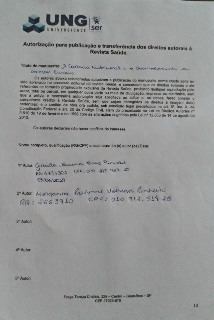Pimentel, G. M. C., & Pinheiro, M. P. N. (2019). A CARÊNCIA NUTRICIONAL E O DESENVOLVIMENTO DE DOENÇAS BUCAIS. Revista Saúde - UNG-Ser - ISSN 1982-3282, 13(1 ESP), 14. Recuperado de https://revistas.ung.br/index.php/saude/article/view/3771