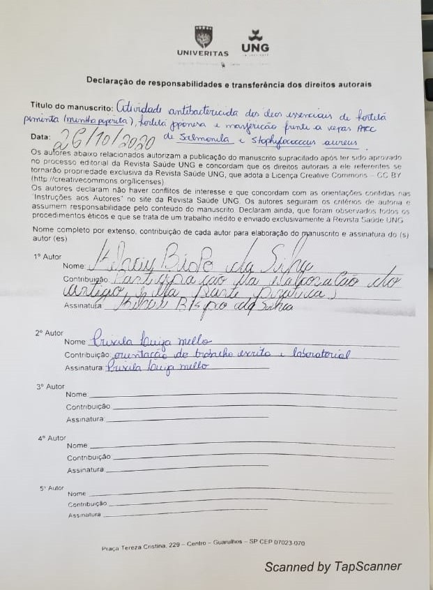 Silva, K. B. da, & Mello, P. L. (2021). ATIVIDADE ANTIBACTERIANA DOS ÓLEOS ESSENCIAIS DE HORTELÃ PIMENTA (Mentha piperita), HORTELÃ JAPONESA (Mentha arvensis) e MANJERICÃO (Ocimum basilicum) FRENTE A CEPAS ATCC DE Salmonella enterica e Staphylococcus aureus. Revista Saúde - UNG-Ser - ISSN 1982-3282, 15(3/4), 17–22. https://doi.org/10.33947/1982-3282-v15n3-4-4374